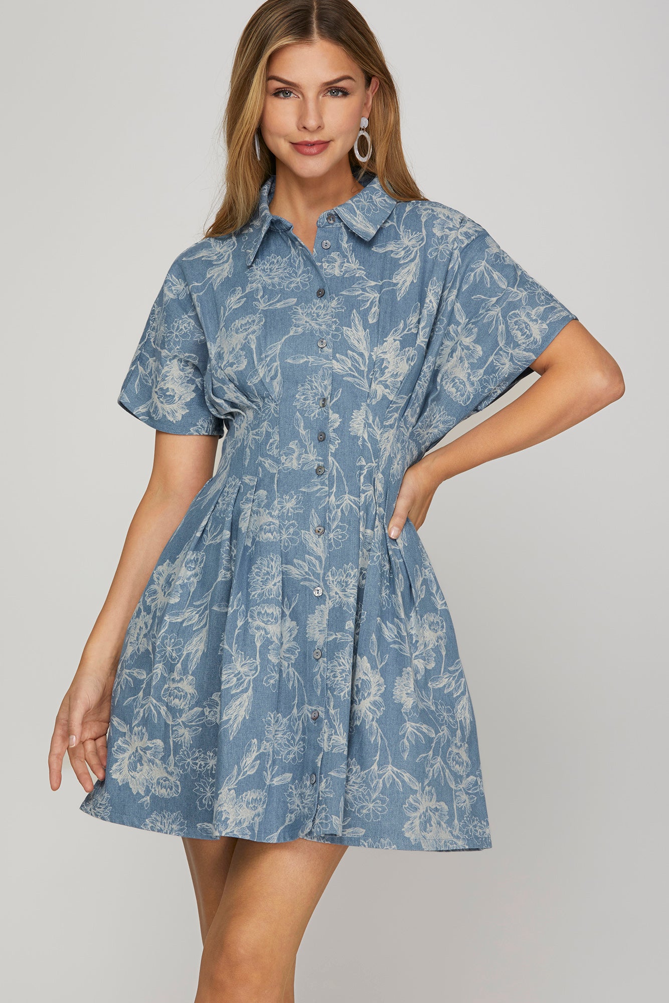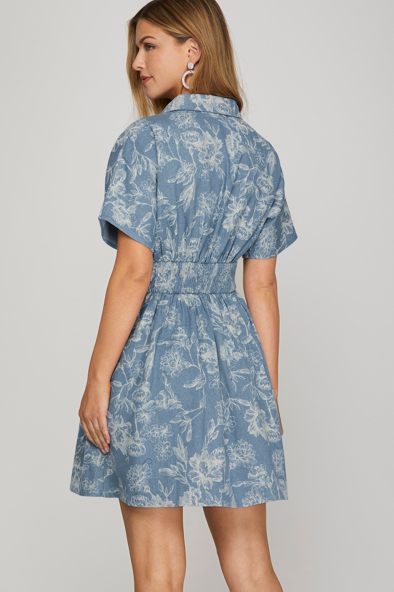 Short sleeve washed print denim mini dress with waist pin tuck, back smocking, and pockets.