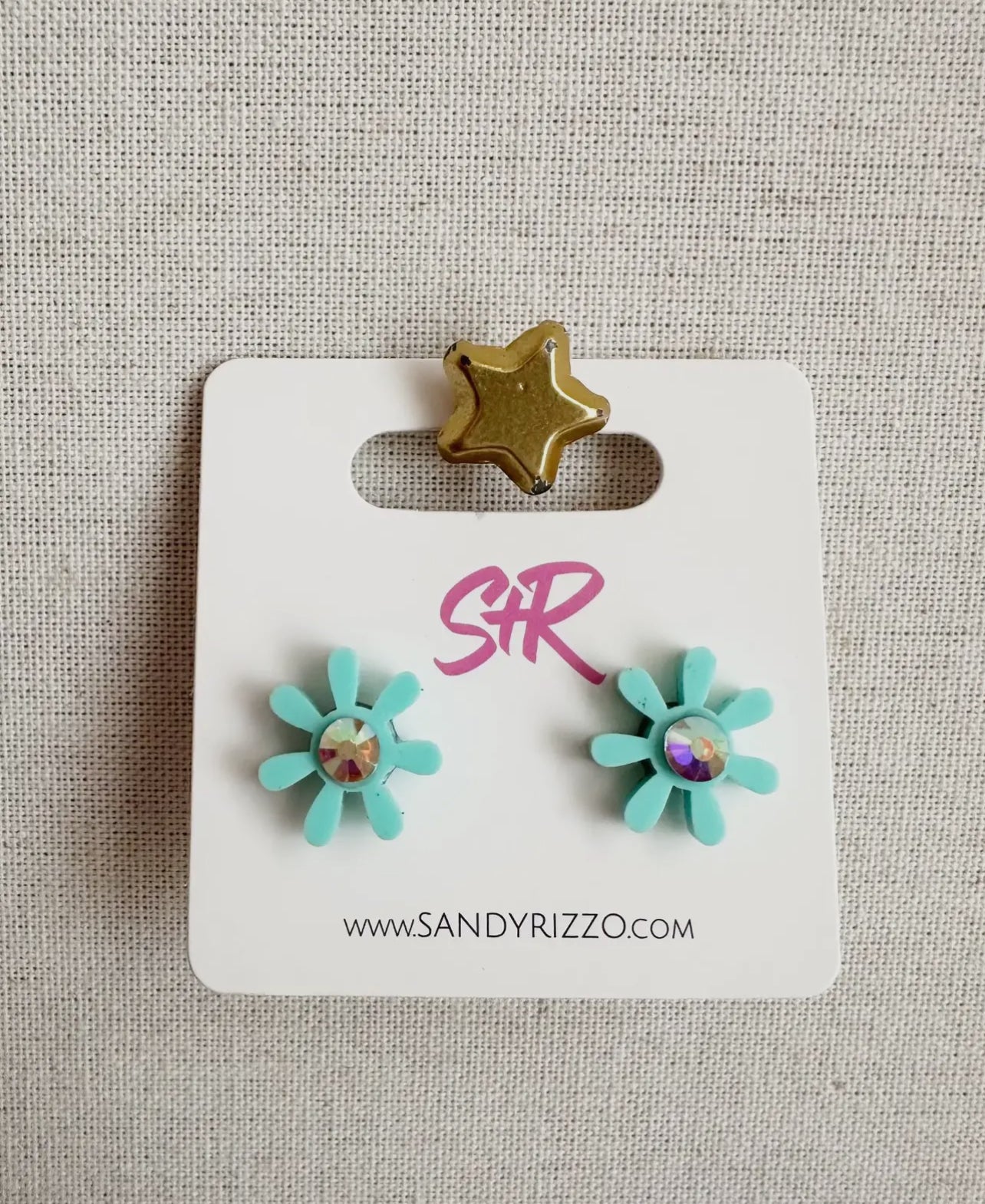 The cutest layered flower stud with a matte turquoise flower topped with an iridescent flower center.  Perfect for you or your little gal!