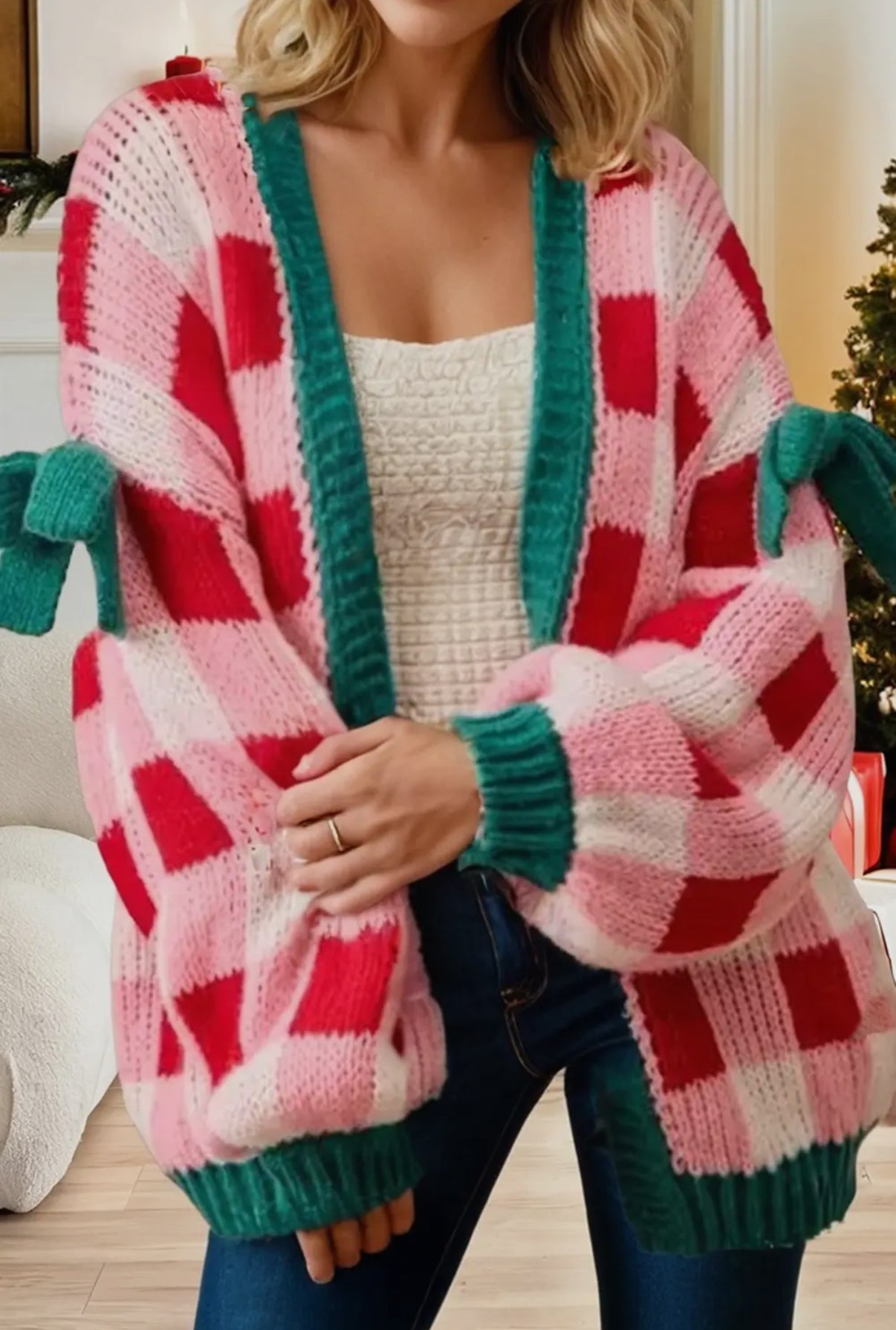 Holiday Womens Sweaters: Christmas Plaid Cardigan With knit bows on the sleeves