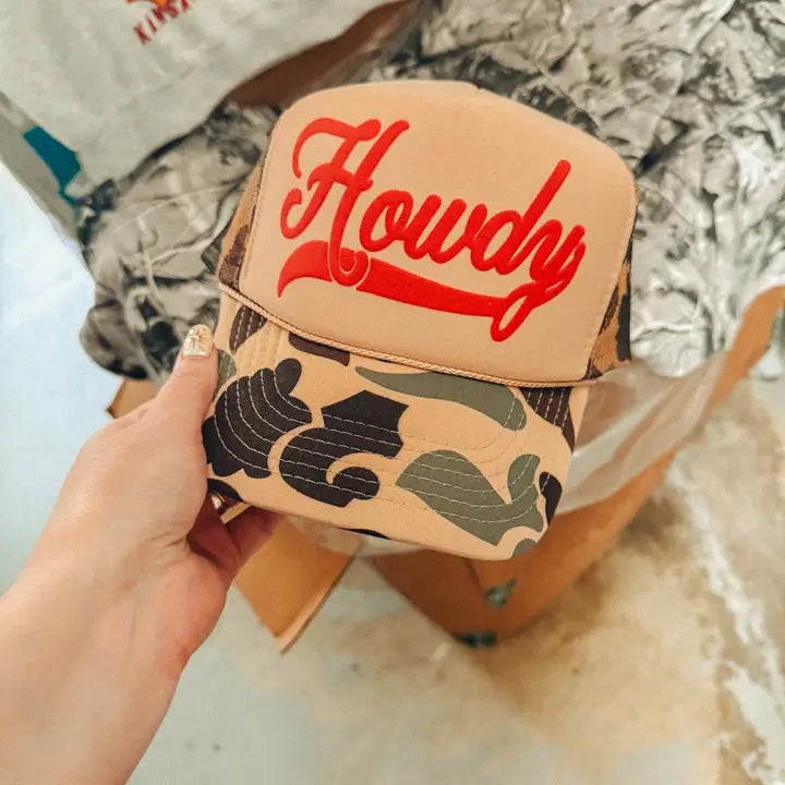 Show of your style in our Howdy Country Western, puff trucker hat. - Features the phrase "Howdy" across the front in a red puff ink - Come with a removable small brown pin attached to each hat - Individually heat pressed onto each hat - 5 Panel, Mesh Back with Snap Back