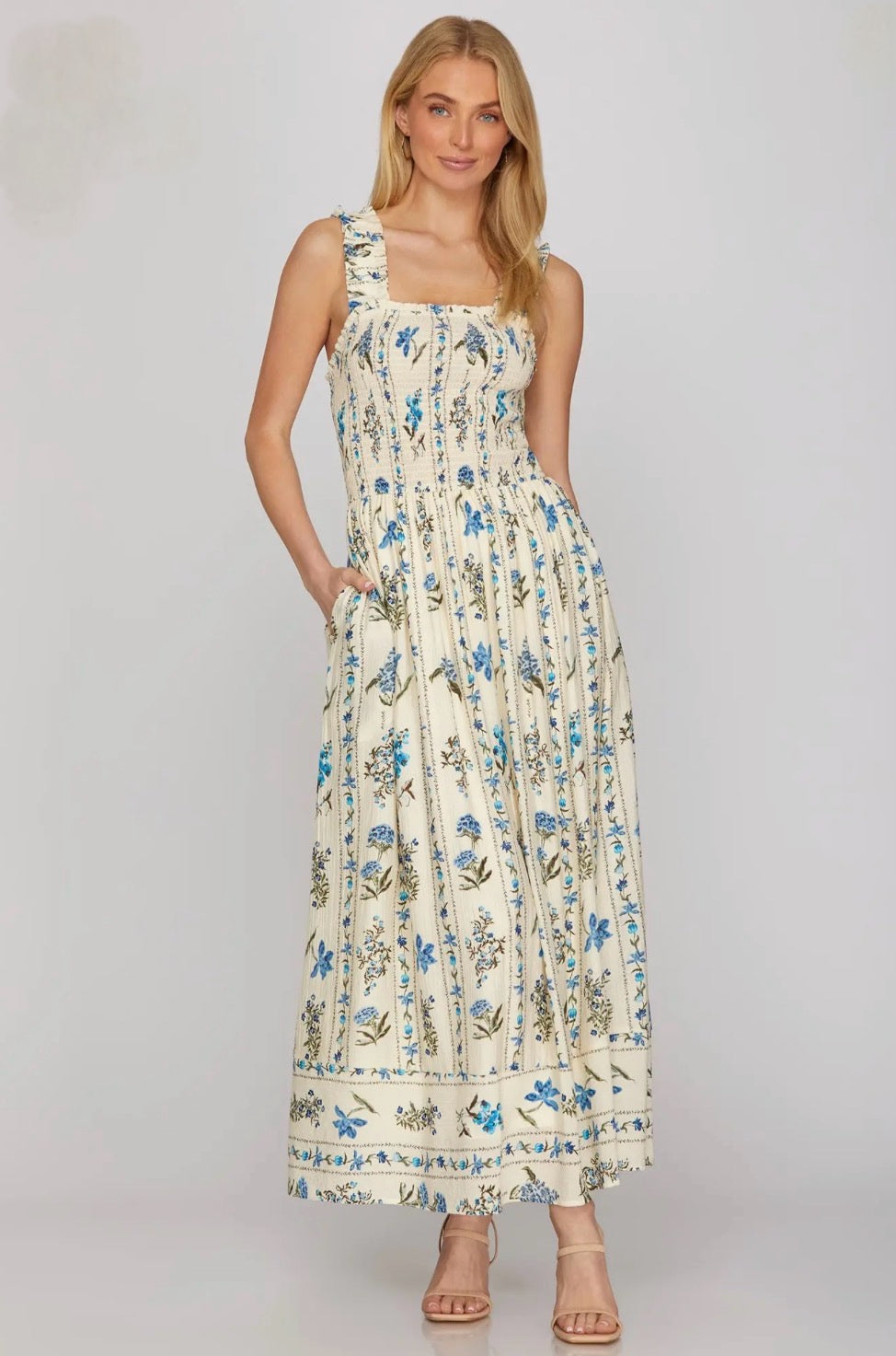 Sleeveless woven print smocked maxi dress with elastic shoulder straps & pockets. The perfect dainty dress to feel elegant & chic!