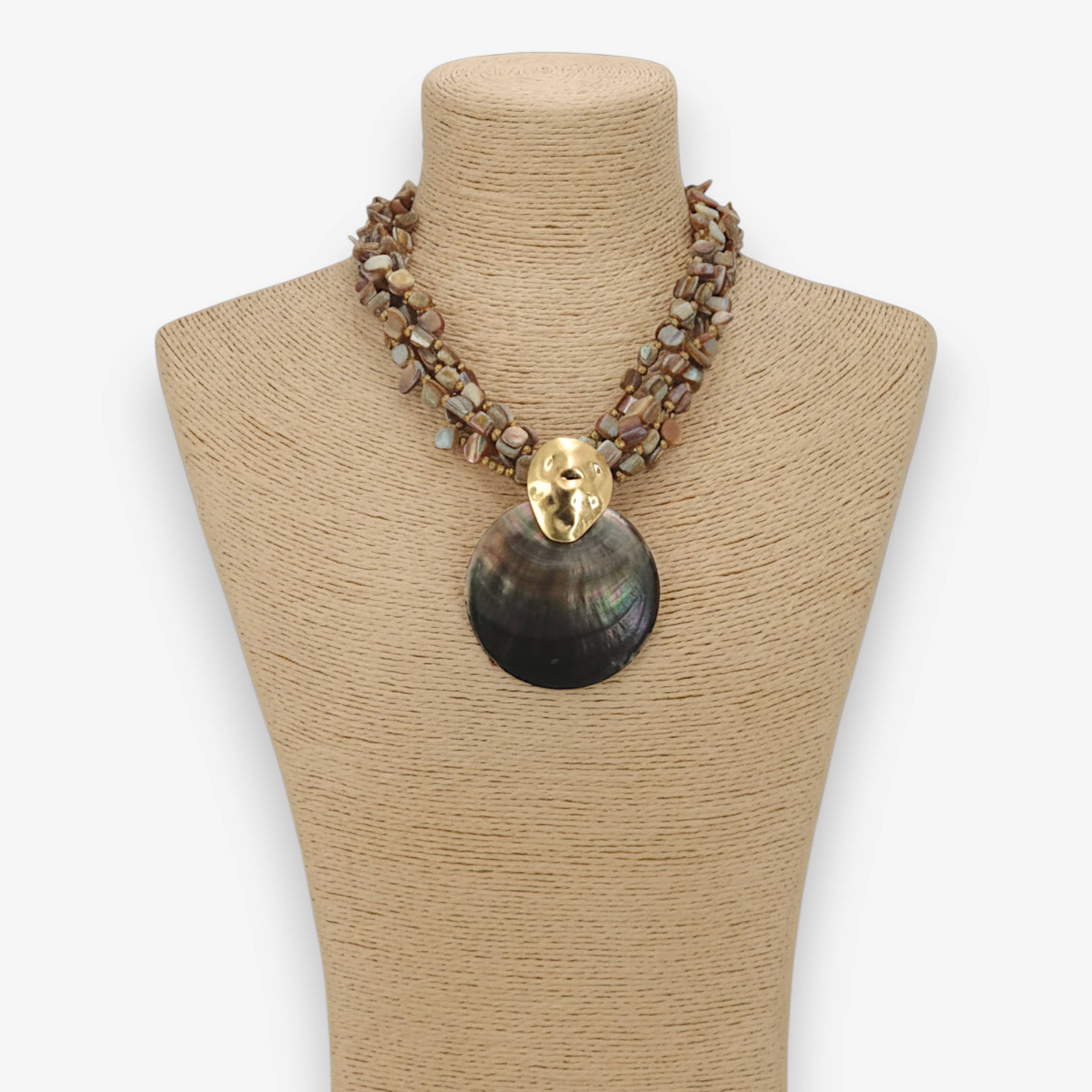 Length:18" +3" Extender ▫️Weight: 3.5 oz ▫️Sandy Stone Chip Beads ▫️Peacock Abalone Clam Shell Pendant ▫️Vintage 14k Gold Plated Hardware ▫️Lobster Claw Clasp ▫️Artisan Double Hand Knotted
