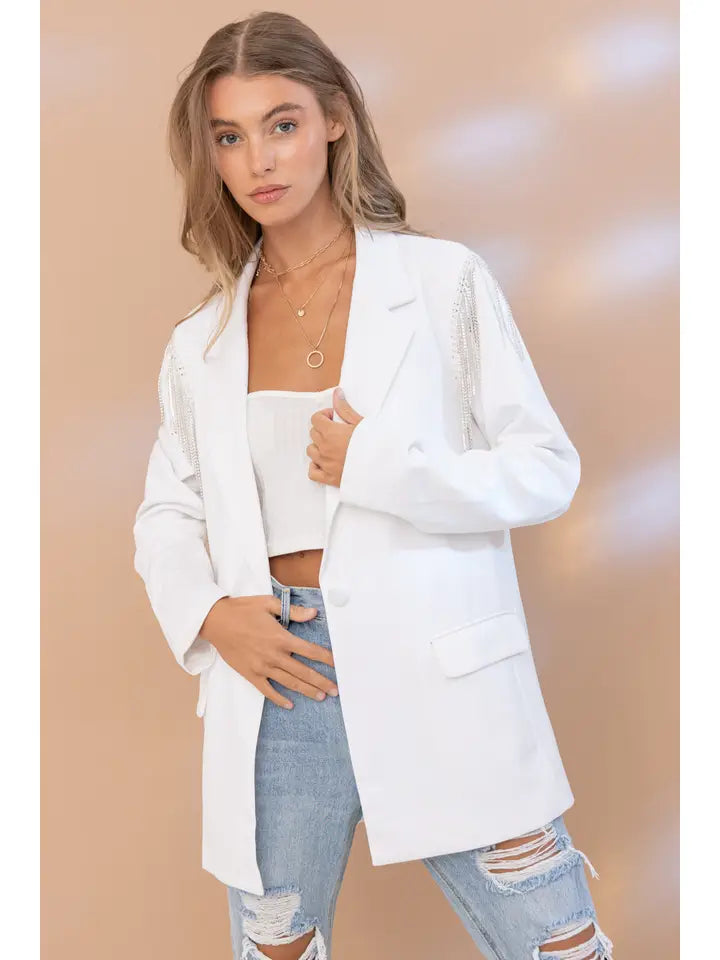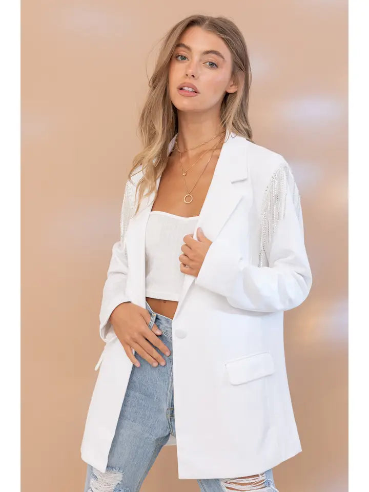 Stretch Boyfriend Fit Rhinestone Fringe Shoulder Open Blazer