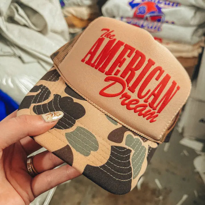 Show off your style in our The American Dream Western, puff trucker hat. - Features the phrase "The American Dream" across the front in a red puff ink - Come with a removable small pin attached to each hat - Individually heat pressed onto each hat - 5 Panel, Mesh Back with Snap Back