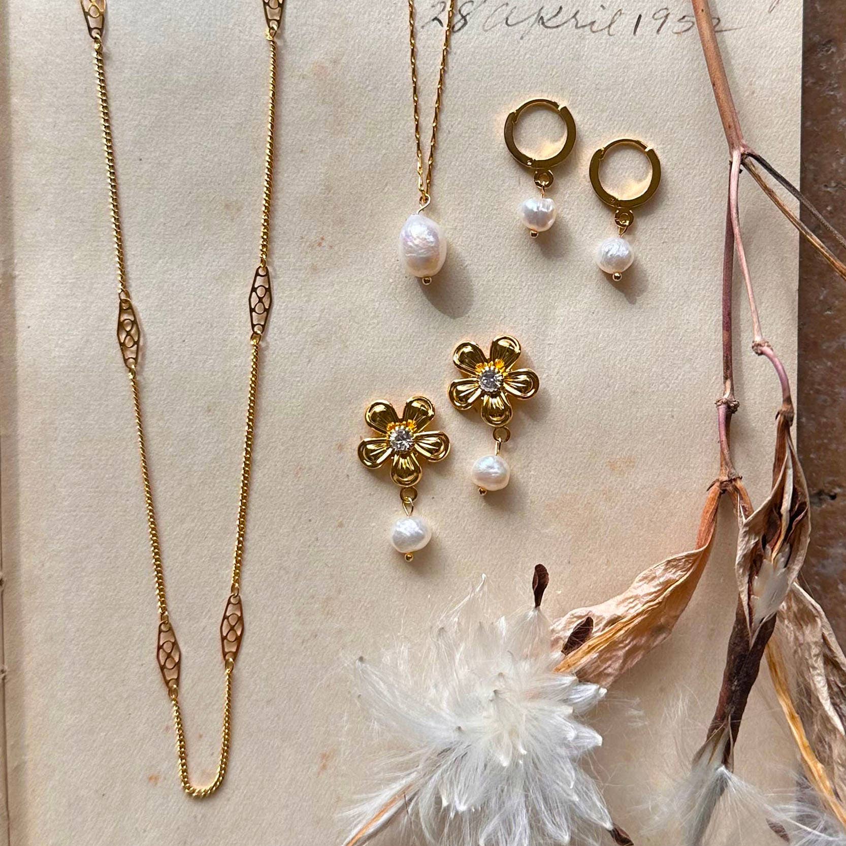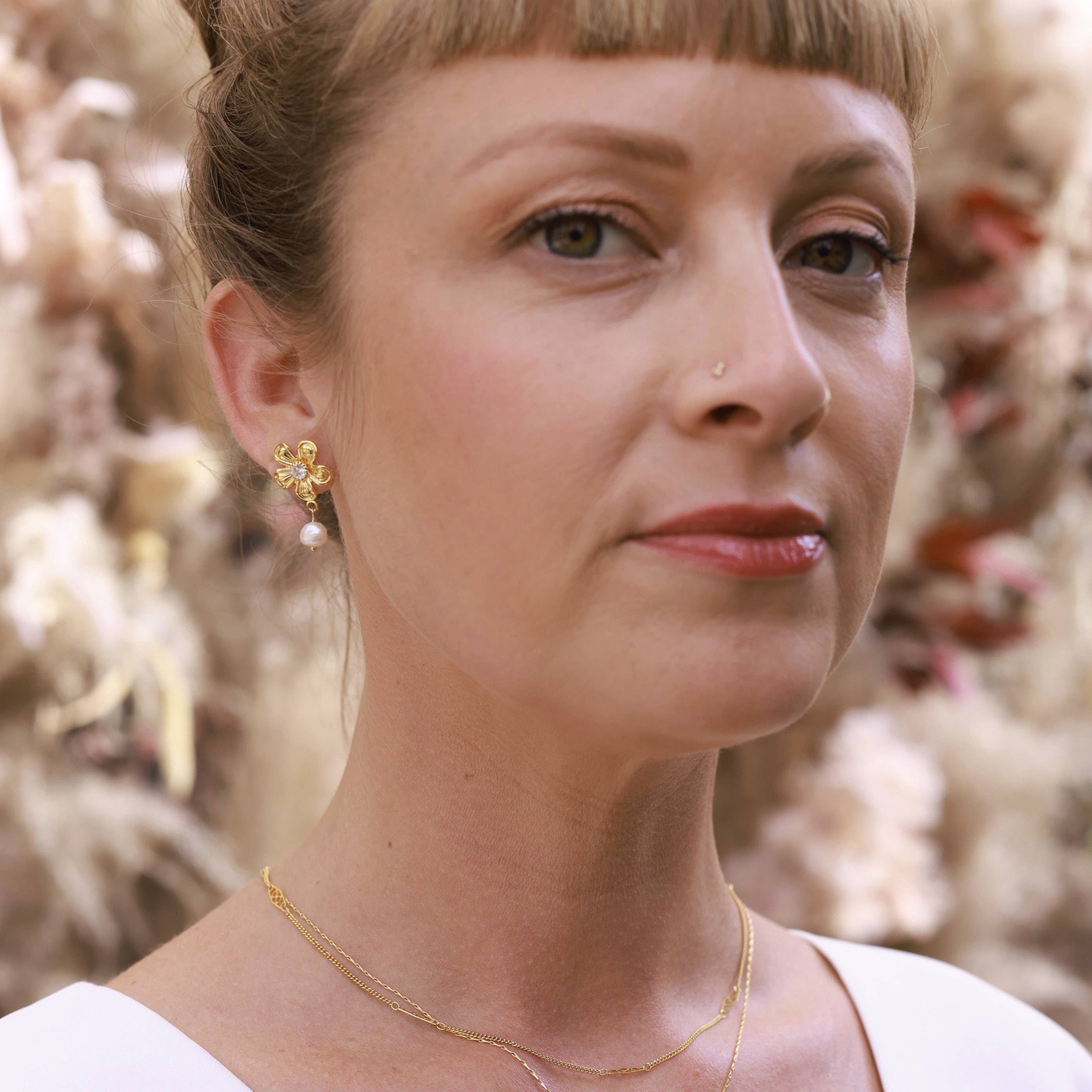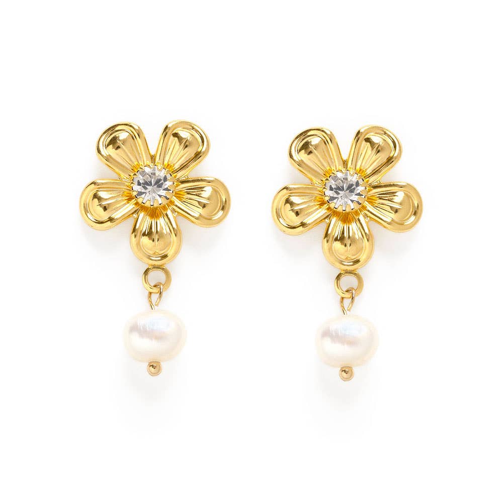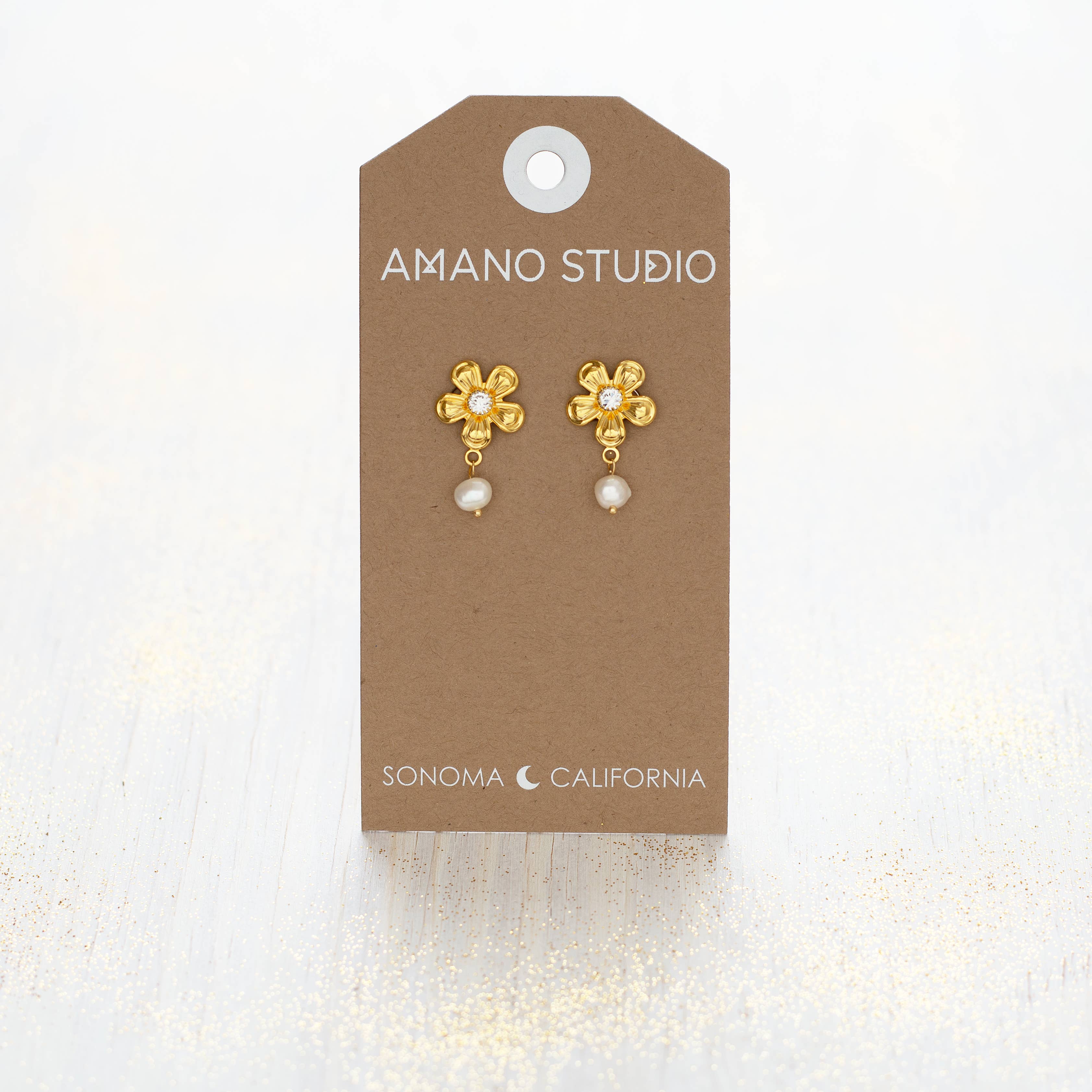 Vintage elegance and romance, these flower stud earrings were made with the original tooling that first created them in the 50's. They feature a 5-7mm fresh water pearl and have surgical steel posts and a 14k gold plate over brass. Designed and assembled in Sonoma California studio. Genuine American Vintage.